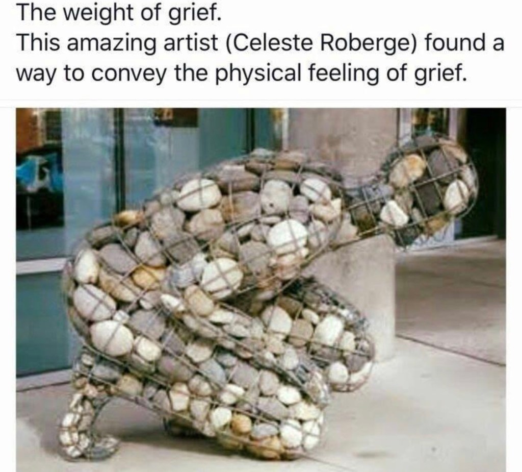 I saw a piece of art. A sculpture of a human form, made of iron rods, doubled over from the weight of rocks. The entirety of the inside of this form was filled with rocks. The piece is called  “the weight of grief” by Celeste Roberge.